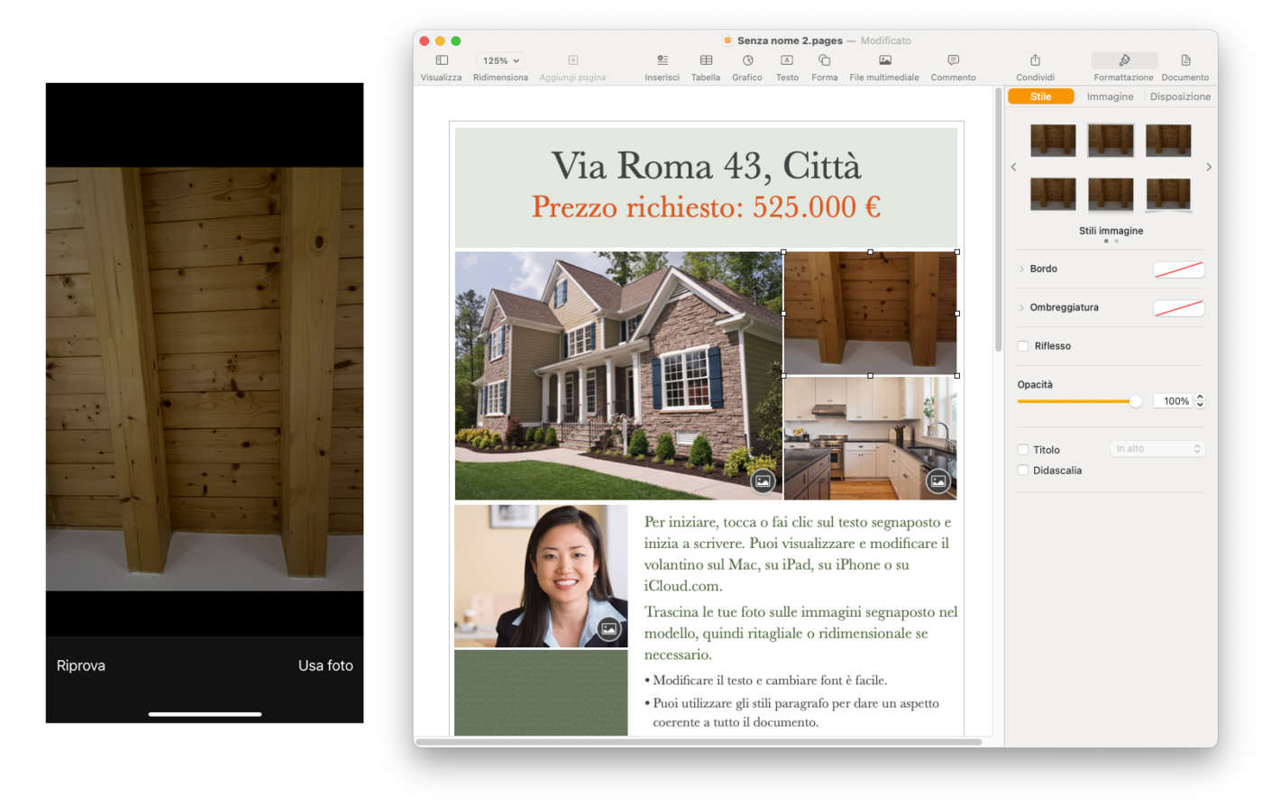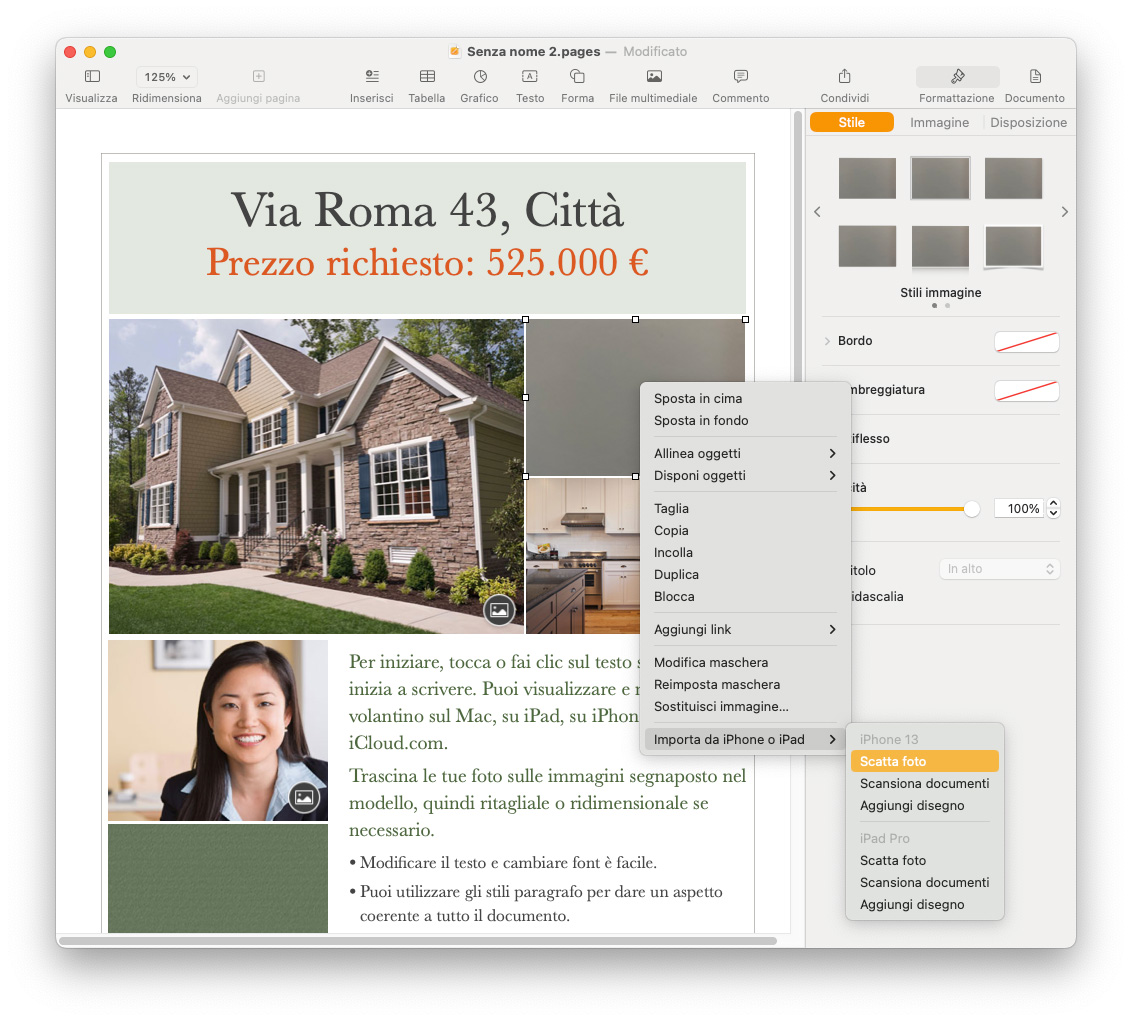 Ad esempio, stiamo realizzando un volantino in Pages sul Mac: facciamo clic destro nel punto in cui desideriamo inserire la foto e, dal menu contestuale, selezioniamo Importa da iPhone > Scatta foto (o Inserisci da iPhone > Scatta foto, a seconda delle applicazioni e delle posizioni).