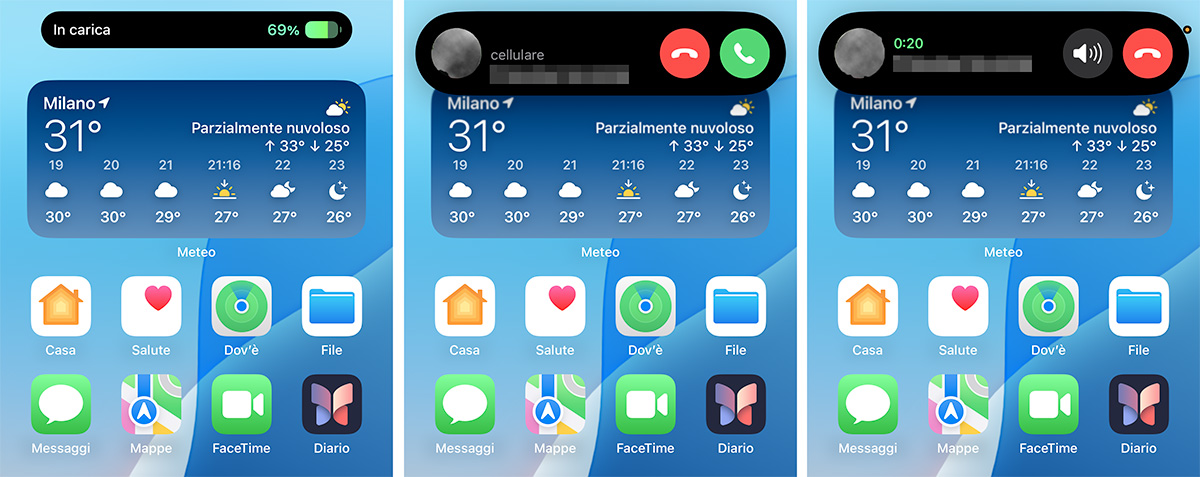 Il secondo caso è ancora più interattivo: la Dynamic Island si espande per darci la possibilità di accettare o rifiutare la telefonata e dopo, nella sua area, possiamo visualizzare il tempo trascorso così come accedere ai principali controlli di una chiamata.