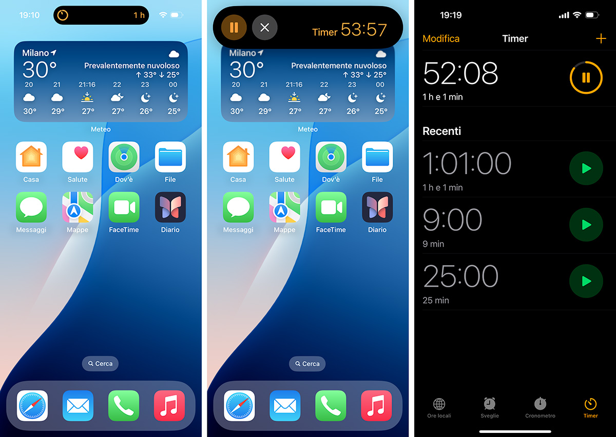 Nel nostro esempio, avviamo un timer e vediamo che la Dynamic Island si estende e fornisce l’indicazione di un timer attivo, nel nostro caso di un’ora.