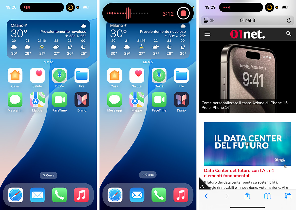 Proseguendo nel nostro esempio, attivando anche la registrazione di un memo vocale, la Dynamic Island fornisce il controllo visivo della registrazione e di fianco, in forma più compatta, continua a visualizzare anche l’icona del timer.