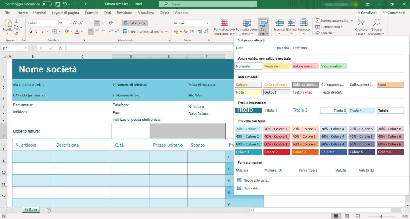 Per applicare uno stile a una o più celle, seleziona la cella o l’intervallo di celle da formattare e, nel gruppo Stili della scheda Home della barra multifunzione, fai clic sul pulsante Stili cella. Seleziona lo stile che desideri per applicarlo alla cella o all’intervallo selezionato.