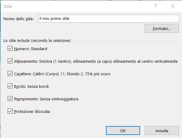 La finestra Stile riassume i parametri configurati e puoi anche deselezionare le caselle di controllo relative alle caratteristiche di formattazione che non vuoi includere nello stile. Quando sei soddisfatto fai clic su OK anche nella finestra Stile.