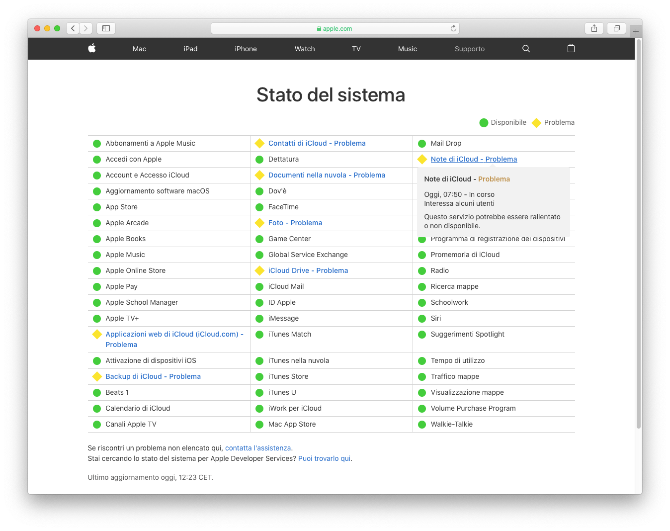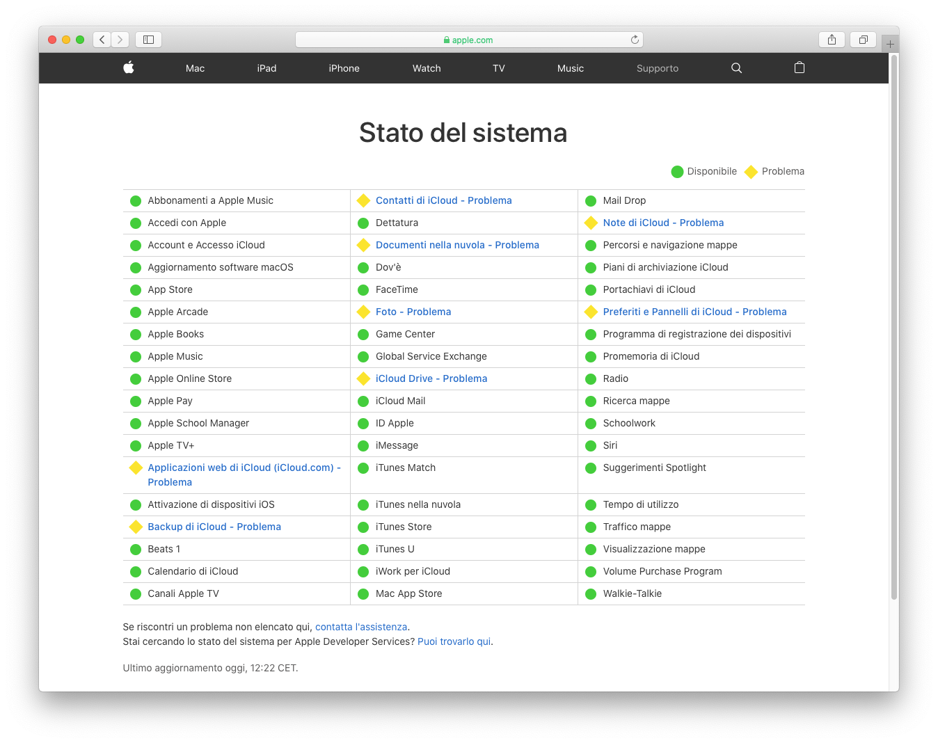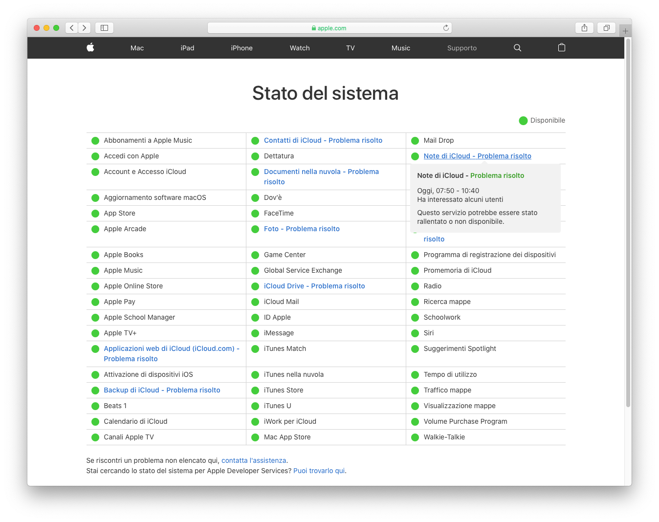 Nel caso ci sia un problema con uno dei servizi (o anche in altre situazioni), il suo nome diventa un link attivo che consente di conoscere ulteriori informazioni al riguardo. Se il problema da noi riscontrato non è presente, o per indicazioni di altro tipo e più approfondite, nella pagina viene riportato anche un link per contattare l’assistenza Apple.