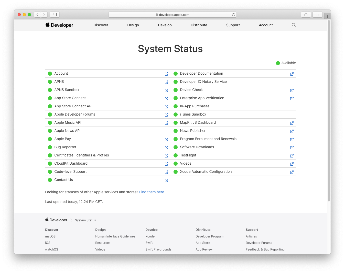 C’è anche una pagina web incentrata in modo specifico al monitoraggio dello stato di sistema degli Apple Developer Services, i servizi dedicati agli sviluppatori delle piattaforme Apple.