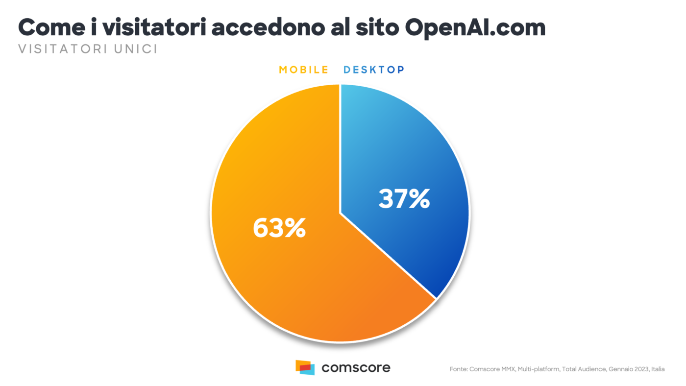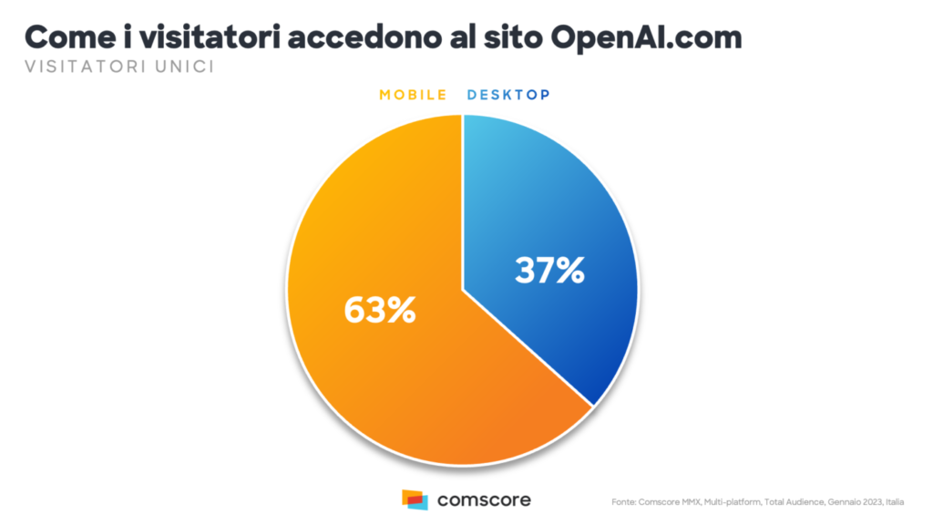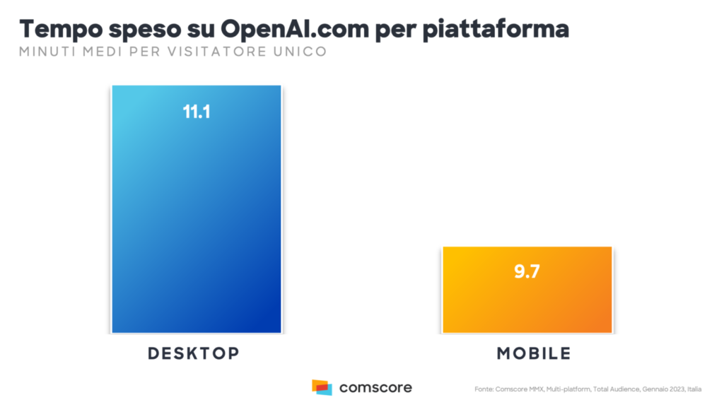 Un’indicazione la si può ricavare dal numero di persone che hanno visitato il sito web di OpenAI, da desktop o mobile. In particolare, OpenAI.com ha registrato oltre 1,4 milioni di visitatori unici in Italia nel solo mese di gennaio 2023, 905mila visitatori unici attraverso mobile e i restanti 523mila da desktop. Sono proprio gli utenti che vi accedono da desktop a trascorrere più tempo sul sito – 11,1 minuti per visitatore al mese rispetto a 9,7 minuti per visitatore al mese da mobile.
