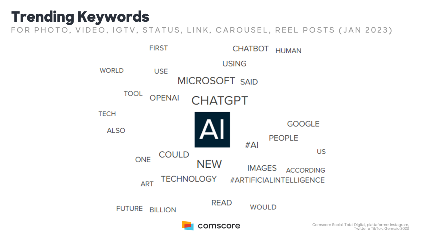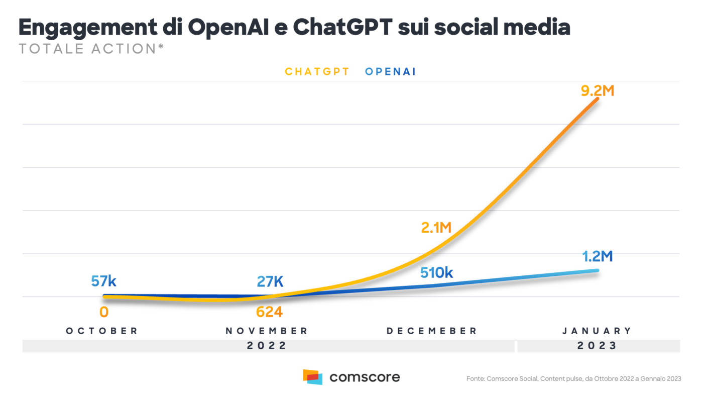 Secondo uno studio di Comscore, a cui le riflessioni fanno riferimento, Per ChatGPT, i numeri sono ancora più alti, con 9,2 milioni di action nel gennaio 2023 e un aumento del 330% rispetto al Q4 2022.