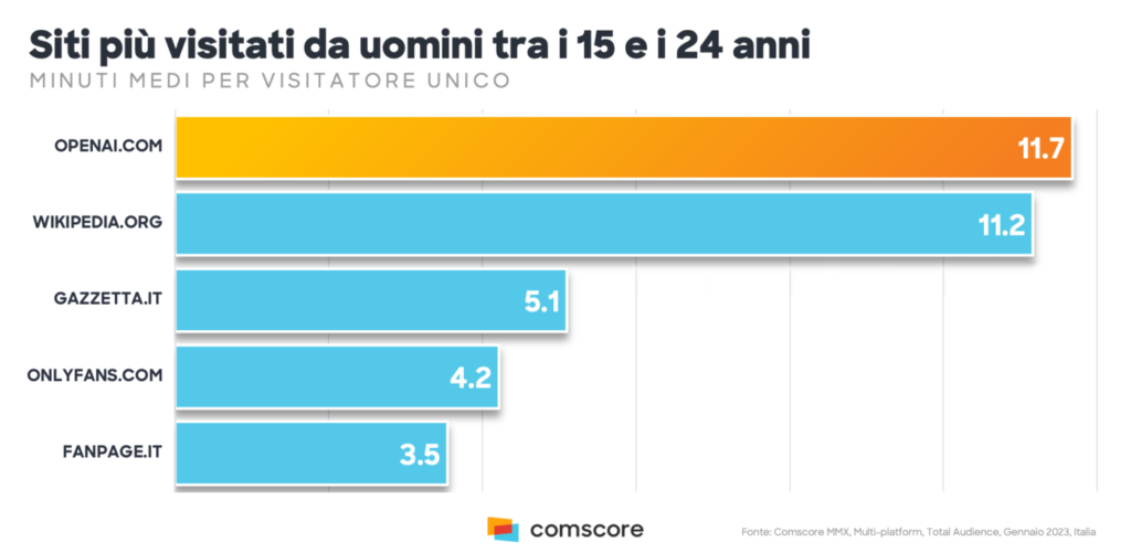 Il grande hype generato da ChatGPT ha spinto OpenAI.com tra i primi 150 siti e app più visitati in Italia, in particolare grazie agli uomini di età compresa tra 15 e 24 anni. Tuttavia, in termini di engagement, questo target ha speso in media solo 13,1 minuti al mese sul sito, significativamente meno delle 23 ore al mese trascorse su Tiktok o delle 11 ore al mese trascorse sul sito di YouTube.