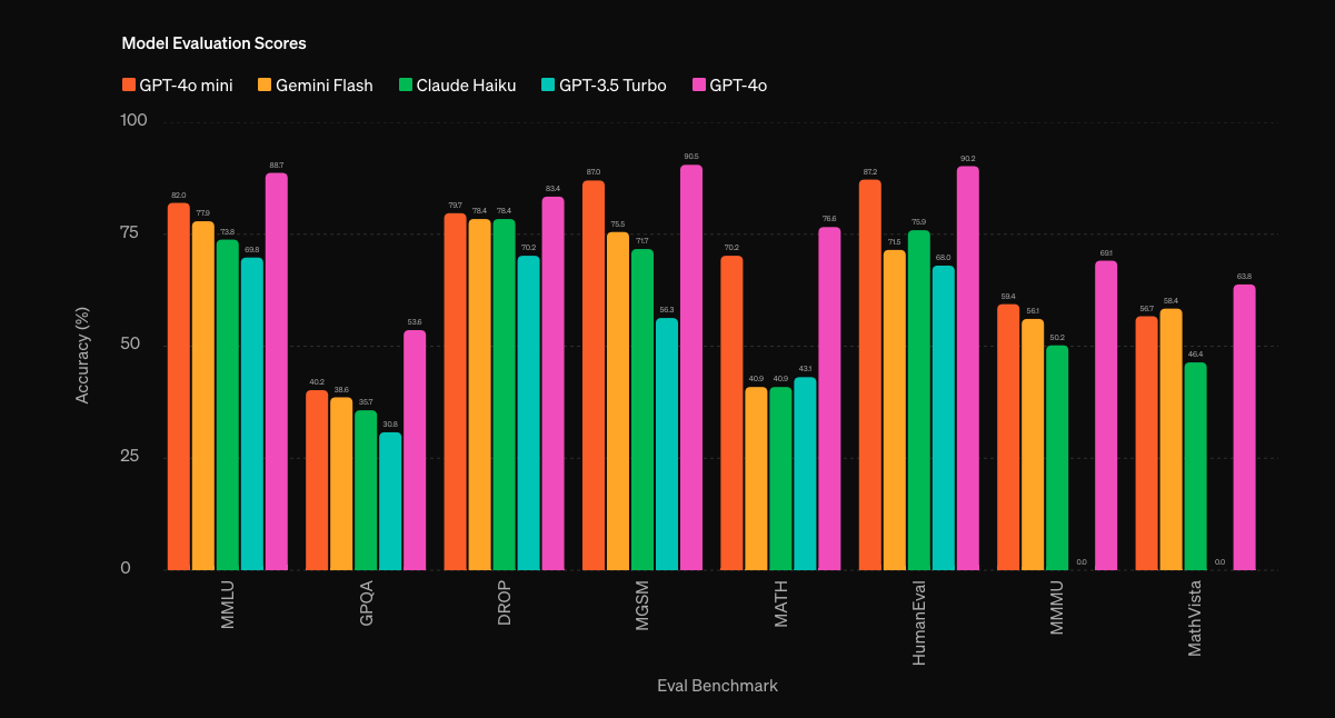 OpenAI afferma che GPT-4o mini supera GPT-3.5 Turbo e altri modelli di piccole dimensioni nei benchmark accademici per quanto riguarda l’intelligenza testuale e il ragionamento multimodale, e supporta la stessa gamma di linguaggi di GPT-4o. Dimostra inoltre ottime prestazioni nelle chiamate di funzione, che possono consentire agli sviluppatori di creare applicazioni che recuperano dati o intraprendono azioni con sistemi esterni, e prestazioni migliori nel contesto lungo rispetto a GPT-3.5 Turbo.