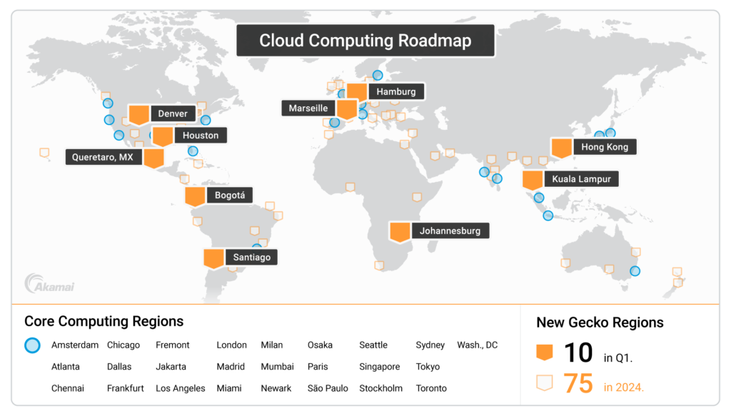 Akamai sta definendo una roadmap rapida, ma pragmatica, per Gecko. Nella prima fase del progetto, annunciata oggi, Akamai si propone di integrare il computing con il supporto di virtual machine in 100 città entro la fine dell’anno. Nel 2024, Akamai ha già installato nuove region con architettura Gecko a Hong Kong SAR; Kuala Lumpur, Malaysia; Querétaro, Messico; e Johannesburg, Sudafrica, oltre che in città senza un’elevata presenza di hyperscaler, tra cui Bogotá, Colombia; Denver, Colorado; Houston, Texas; Amburgo, Germania; e Marsiglia, Francia. Entro la fine del primo trimestre, è prevista l’implementazione del progetto Gecko nella decima sede a Santiago, in Cile. Oltre a queste 10 nuove sedi in cui è stato implementato il progetto Gecko e alle 25 core compute region già esistenti, Akamai intende aggiungere centinaia di città alla sua rete di cloud computing globale nel corso dei prossimi anni.