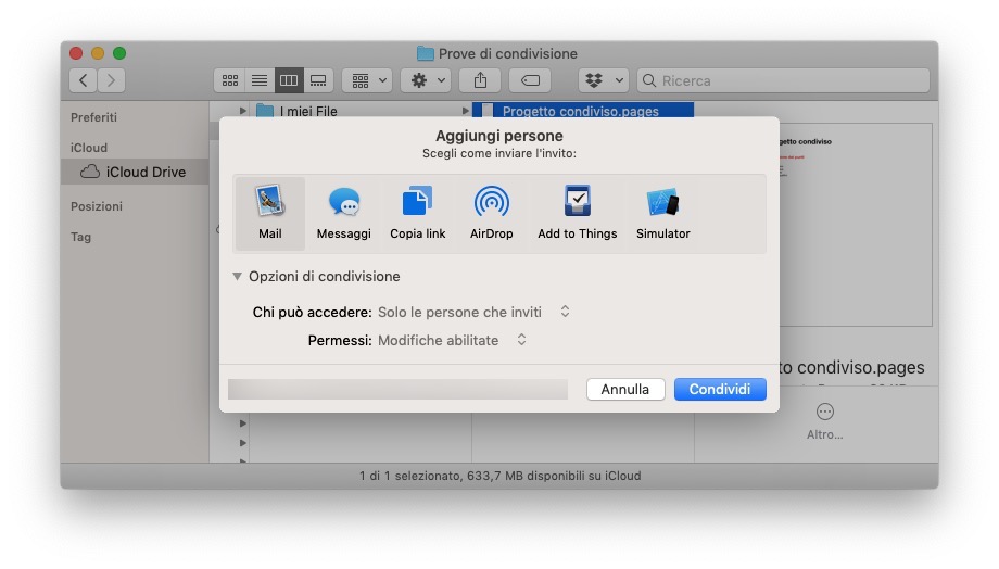 Il Mac apre una finestra per dare la possibilità di scegliere come inviare l’invito al file condiviso. Ad esempio puoi inviare il link dell’invito via Mail o con Messaggi.