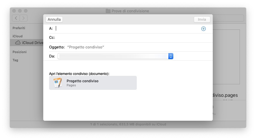macOS apre la finestra di composizione del messaggio email: inserisci il destinatario e fai clic su Invia, per inviare l’invito. Volendo, puoi personalizzare l’oggetto della mail e aggiungere del testo nel corpo del messaggio.