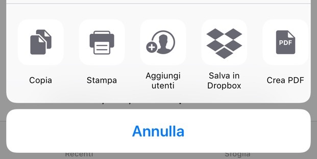 Anche su iPhone, una volta condiviso il documento, se lo selezioni e tocchi di nuovo Condividi nel menu a comparsa, la voce ora sarà Mostra utenti e aprirà la schermata in cui è possibile visualizzare le persone con le quali il file è condiviso, modificare le opzioni e interrompere la condivisione.