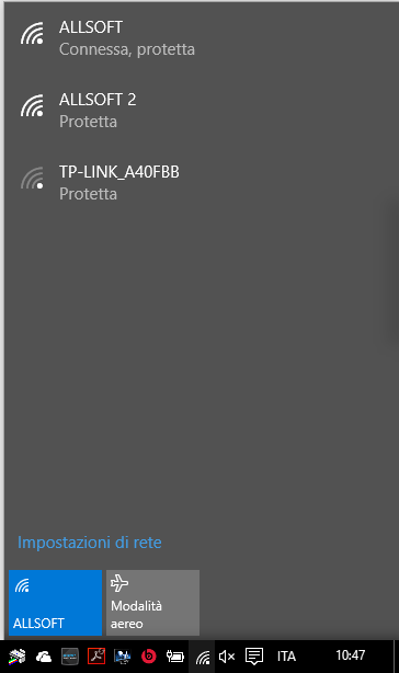 La schermata per configurare una rete in Windows 10 si apre invece facendo clic sull’icona della rete (ethernet o WiFi) nella traybar quindi cliccando su Impostazioni di rete.