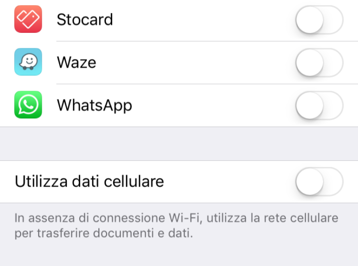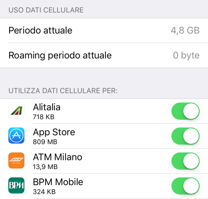 L’elenco non è in ordine di consumo ma alfabetico. Scorriamolo per scoprire le app più “esose” nell’utilizzo della banda e, se opportuno, blocchiamo loro l’accesso alla rete cellulare spostando il cursore corrispondente.