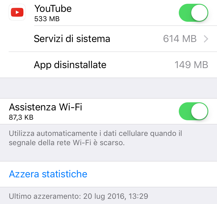Wi-Fi Assist, che in italiano si chiama Assistenza Wi-Fi, è una funzione introdotta in iOS per garantire che nel caso in cui la connessione Wi-Fi che stiamo usando cada per qualche motivo, venga subito sostituita dalla rete cellulare. È una funzione che ha molti usi positivi ma anche un rischio: se abbiamo optato per usare il Wi-Fi è anche per consumare meno (o affatto) banda mobile, cosa che l’opzione di fatto nega.