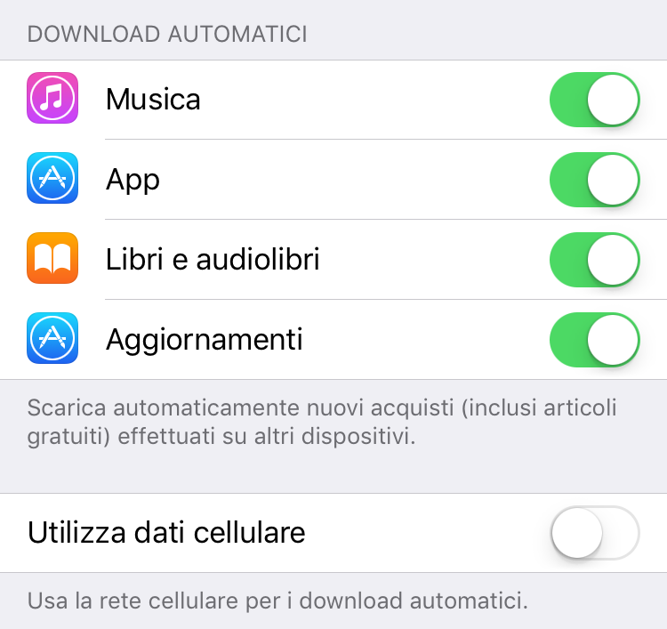 Già che ci siamo, con le opzioni precedenti a quella descritta possiamo definire quali elementi (musica, app, aggiornamenti…) possono essere scaricati automaticamente dal nostro iPhone.