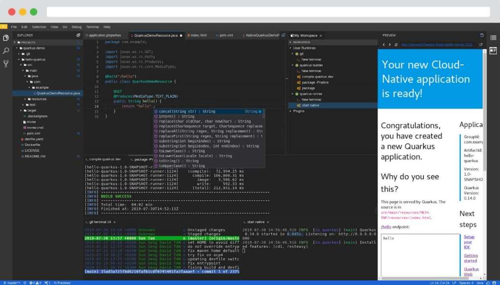 OpenShift 4 ha un focus particolare verso gli sviluppatori. È stata implementata una nuova developer console che offre una visualizzazione personalizzabile dei contesti applicativi, e una serie di azioni “contestuali” che offrono un accesso rapido alle funzionalità più utilizzate: creazione di rotte, link di applicazioni, accesso al codice sorgente.