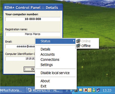 - 1 – Durante l’installazione della parte Desktop di RDM+ sui PC che si desidera controllare a distanza viene creato un account con nome utente e password, fondamentali per la sicurezza in quanto servono ad evitare accessi indesiderati al PC sul quale si installa RDM+. Il server centrale assegna al PC un codice unico, che si può controllare passando il mouse sull’icona di RDM+ nella taskbar. Un clic destro sull’icona apre un menu dove si può modificare lo status da on line a offline, impostare la connessione automatica e verificare se ci sono client mobili connessi.