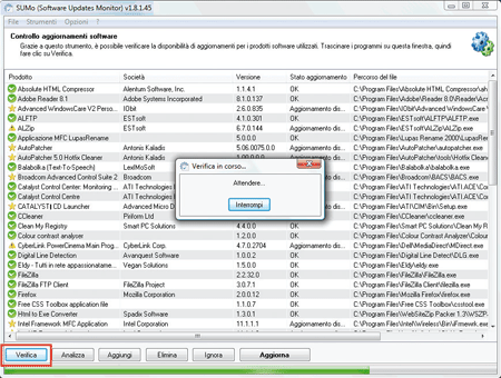 All’importanza delle sua finalità, il programma affianca la semplicità di utilizzo. Dopo averlo lanciato in esecuzione, infatti, cerca automaticamente i programmi installati in Windows, per mostrarne l’elenco in una tabella. Per controllare se sono disponibili aggiornamenti, basta essere connessi in Internet e fare clic sul pulsante Verifica.