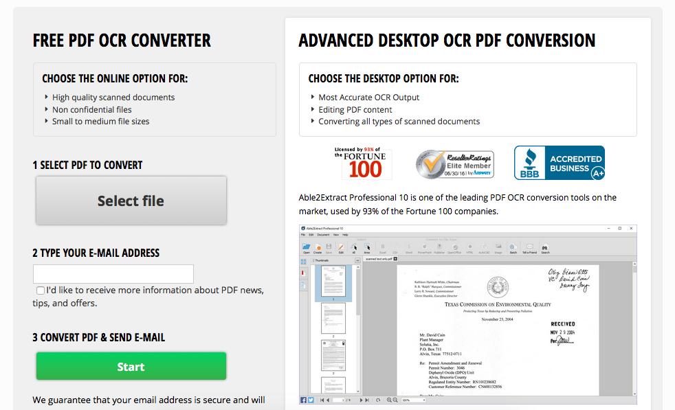 La pagina del servizio gratuito si raggiunge a questo link. Nella parte destra ci sono i rimandi al software a pagamento di Investintech, a sinistra la sezione per caricare il file. L’operazione è banale: si clicca su Select file, si “paga” con il proprio indirizzo di email e poi si clicca su Start per avviare la conversione.