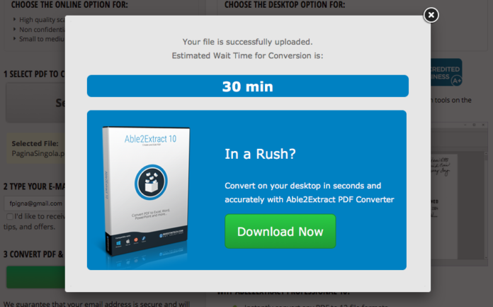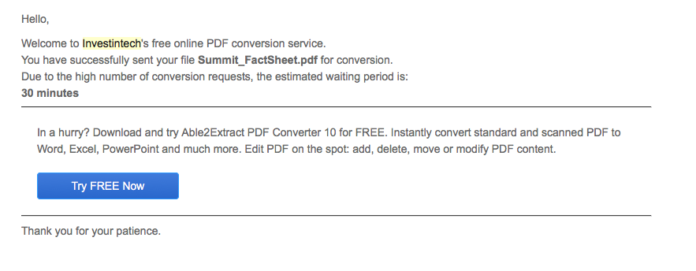 Il servizio manda una prima mail di conferma di aver ricevuto il PDF da convertire. Meglio controllare che sia arrivata perché la formulazione del messaggio è un po’ troppo promozionale e c’è il rischio che l’email venga bloccata dai filtri antispam. Il problema è che poi lo sarebbe anche la mail con il link per scaricare il documento convertito.