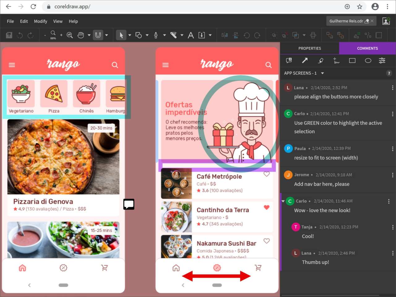 I commenti e le annotazioni permettono inoltre di mantenere tutti aggiornati e di dare seguito ai feedback, al contempo risparmiando tempo e spazio prezioso sullo schermo. I collaboratori possono accedere ai file di progettazione condivisi e fornire suggerimenti e osservazioni in CorelDraw.app, facendo il sign-in come ospite o con un account Corel nel browser web, su qualsiasi dispositivo.