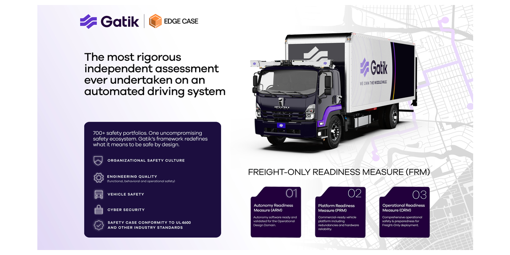 “From the beginning, Gatik’s approach to safety has been defined by an uncompromising commitment to the highest standards, both internal and external” said Dr. Adam Campbell, Gatik’s Head of Safety. “The independent assessment that we have pursued at Gatik meets the level of transparency that policymakers, first responders, business partners, and everyday drivers expect and deserve. In our view, TÜV SÜD’s assessment represents a tremendous vote of confidence in our approaches to scaling safety in our Safety Assessment Framework, serving as the foundation for our launch of Freight-Only commercial operations at scale this year.”