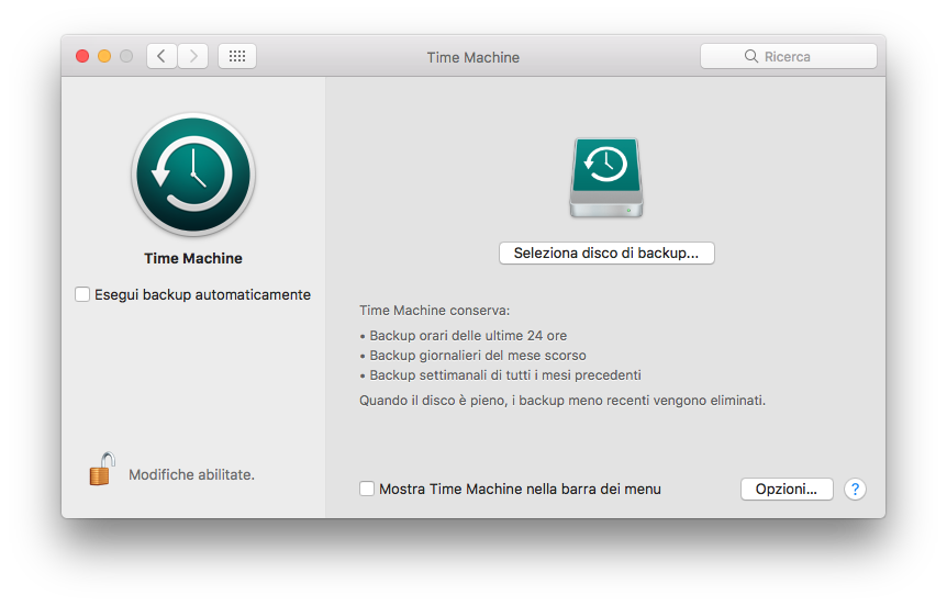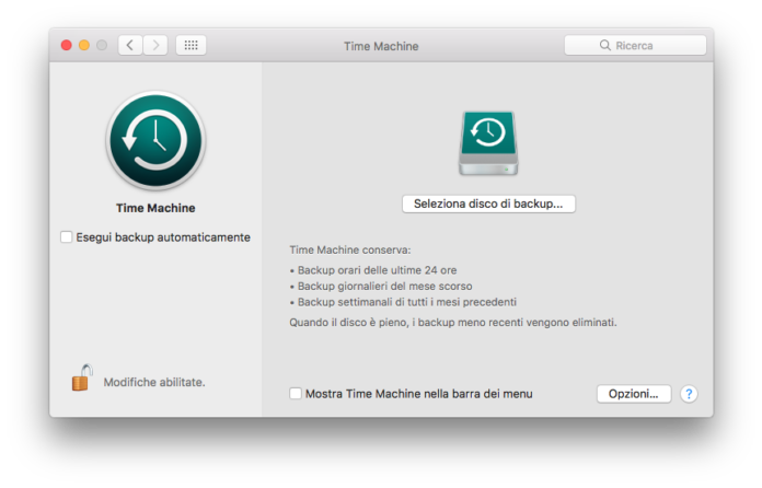 A questo punto eseguiamo il backup “definitivo” del Mac, l’ultimo prima della sua dismissione. Se usiamo regolarmente Time Machine eseguiamo un nuovo backup come al solito, ma per sicurezza eseguiamone anche un altro su un disco diverso (questo sarà un backup nuovo, quindi da zero e più lungo). Quelli veramente attenti alla sicurezza potrebbero anche fare una clonazione del disco su un altro drive, con utility come Carbon Copy Cloner.