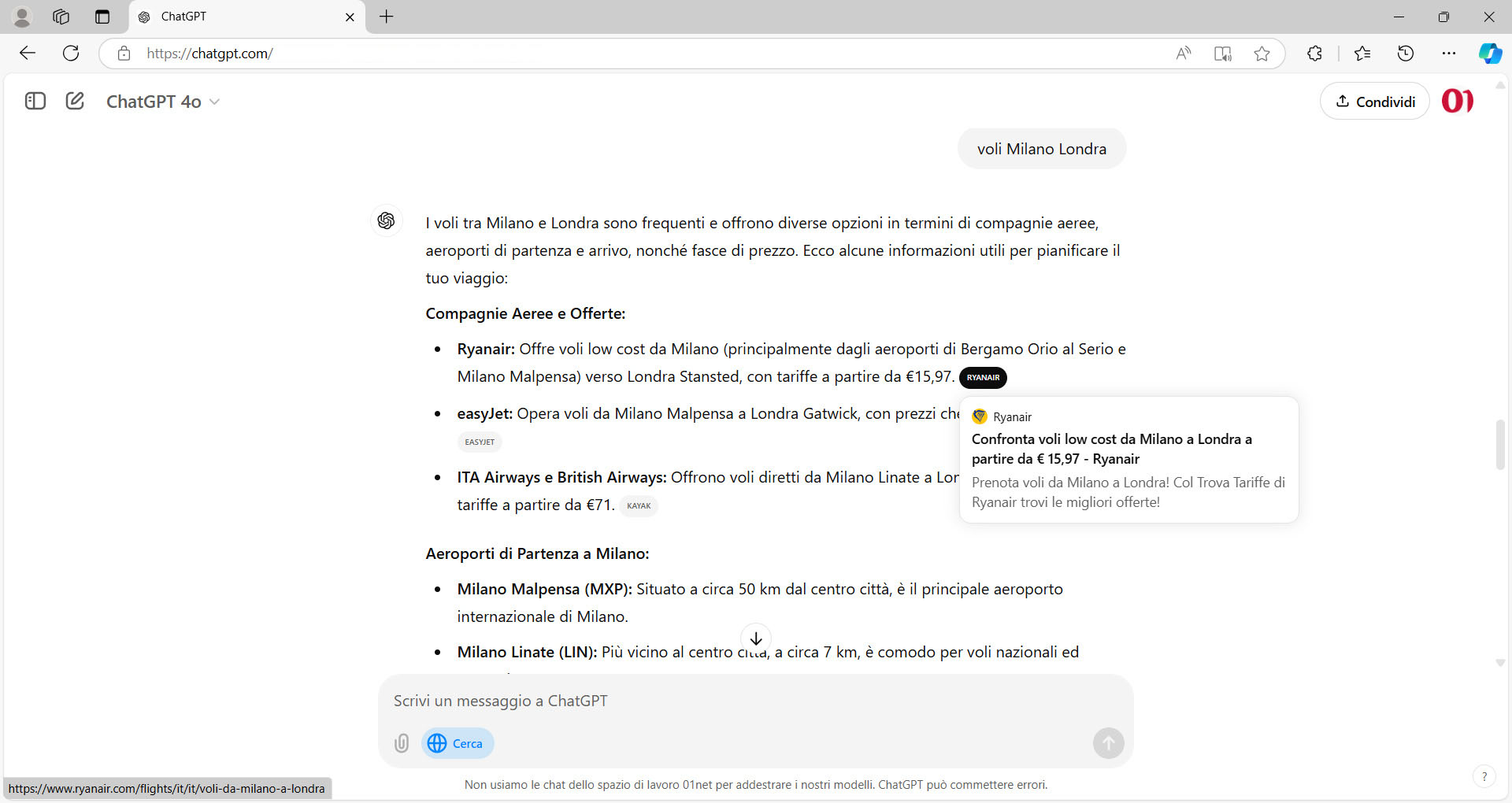 Proviamo dunque a fare la nostra prima ricerca. Mettiamo di aver bisogno di informazioni sui voli da Milano a Londra: nel nostro esempio, abbiamo digitato semplicemente “voli Milano Londra” e inviato il messaggio a ChatGPT.