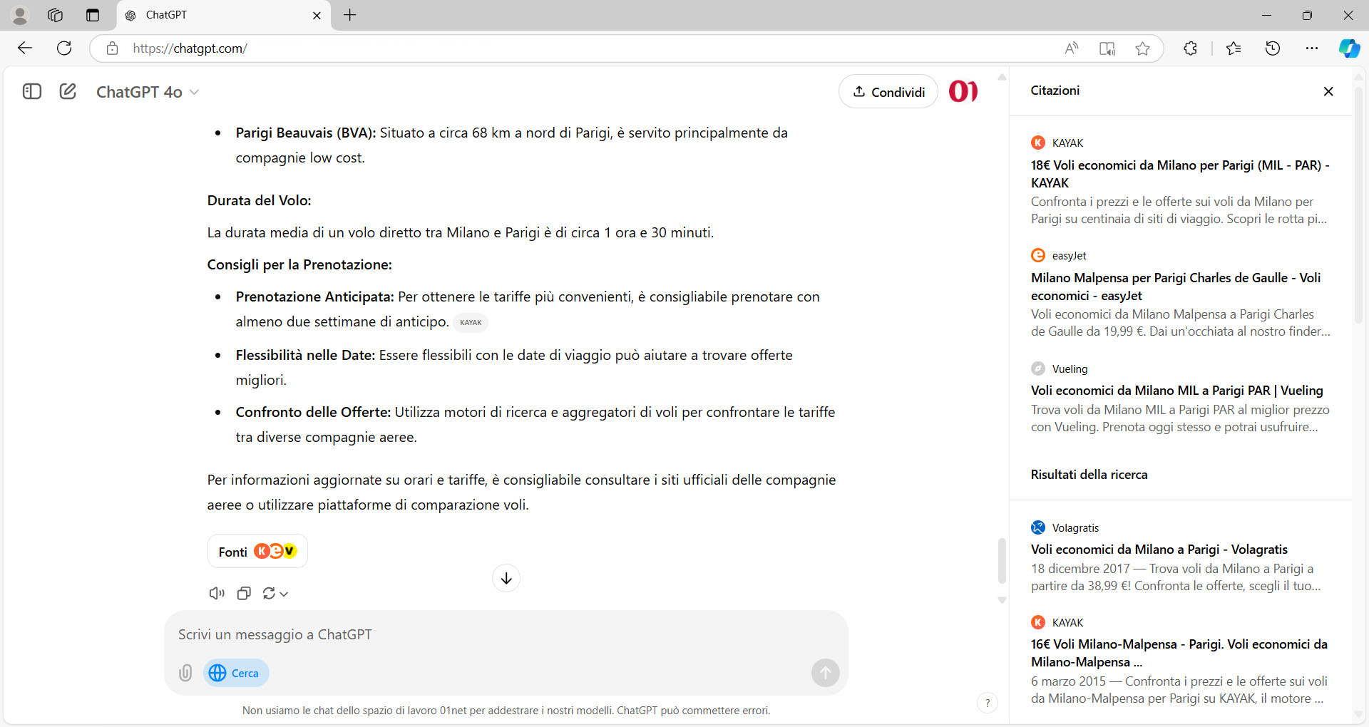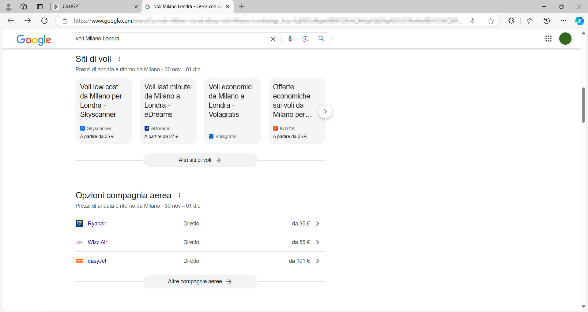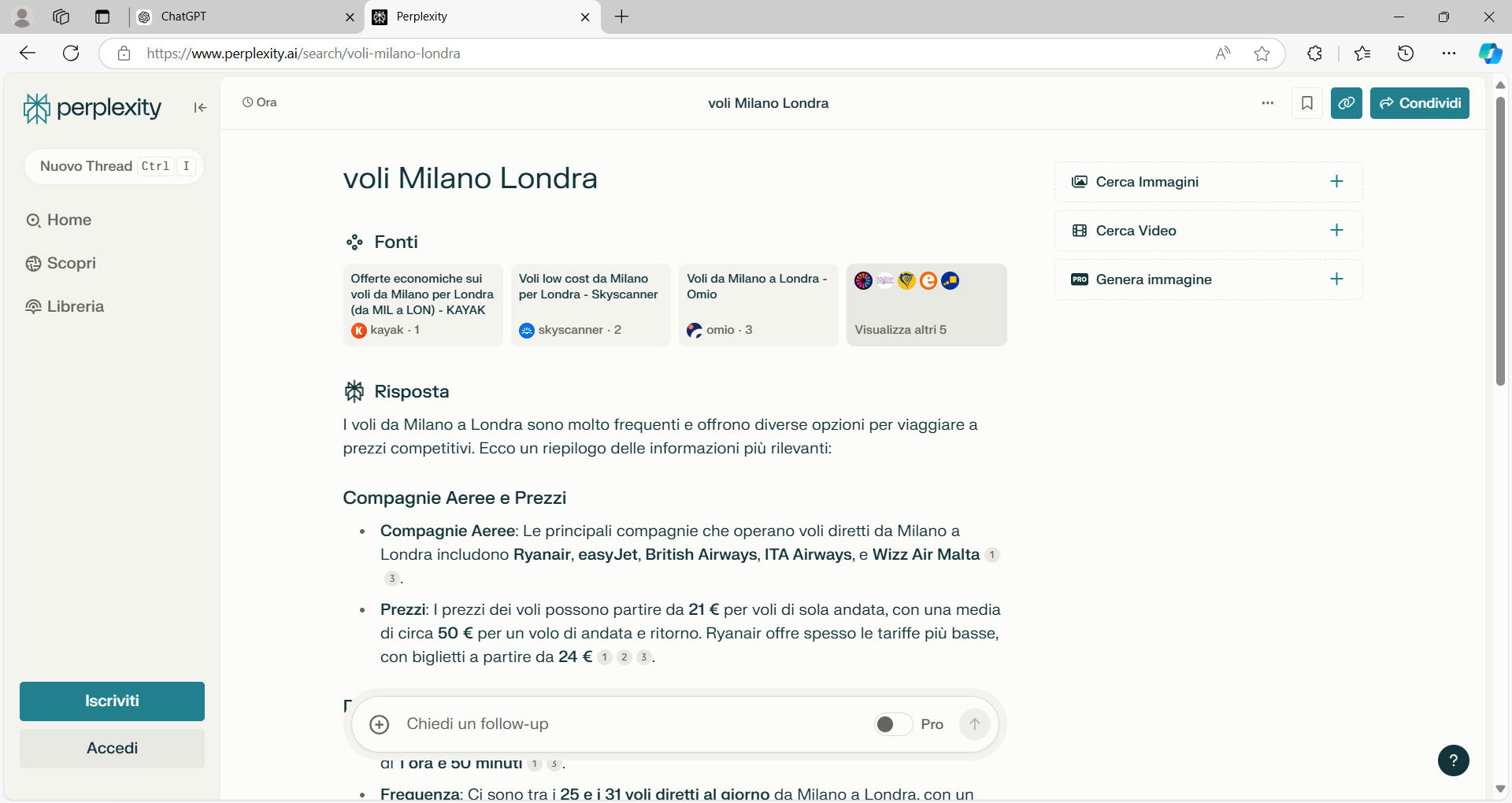 Anche specificando una data precisa, ad esempio con il prompt “voli Milano Londra domani”, ChatGPT search forniva comunque una risposta più generica rispetto a quella di Google.