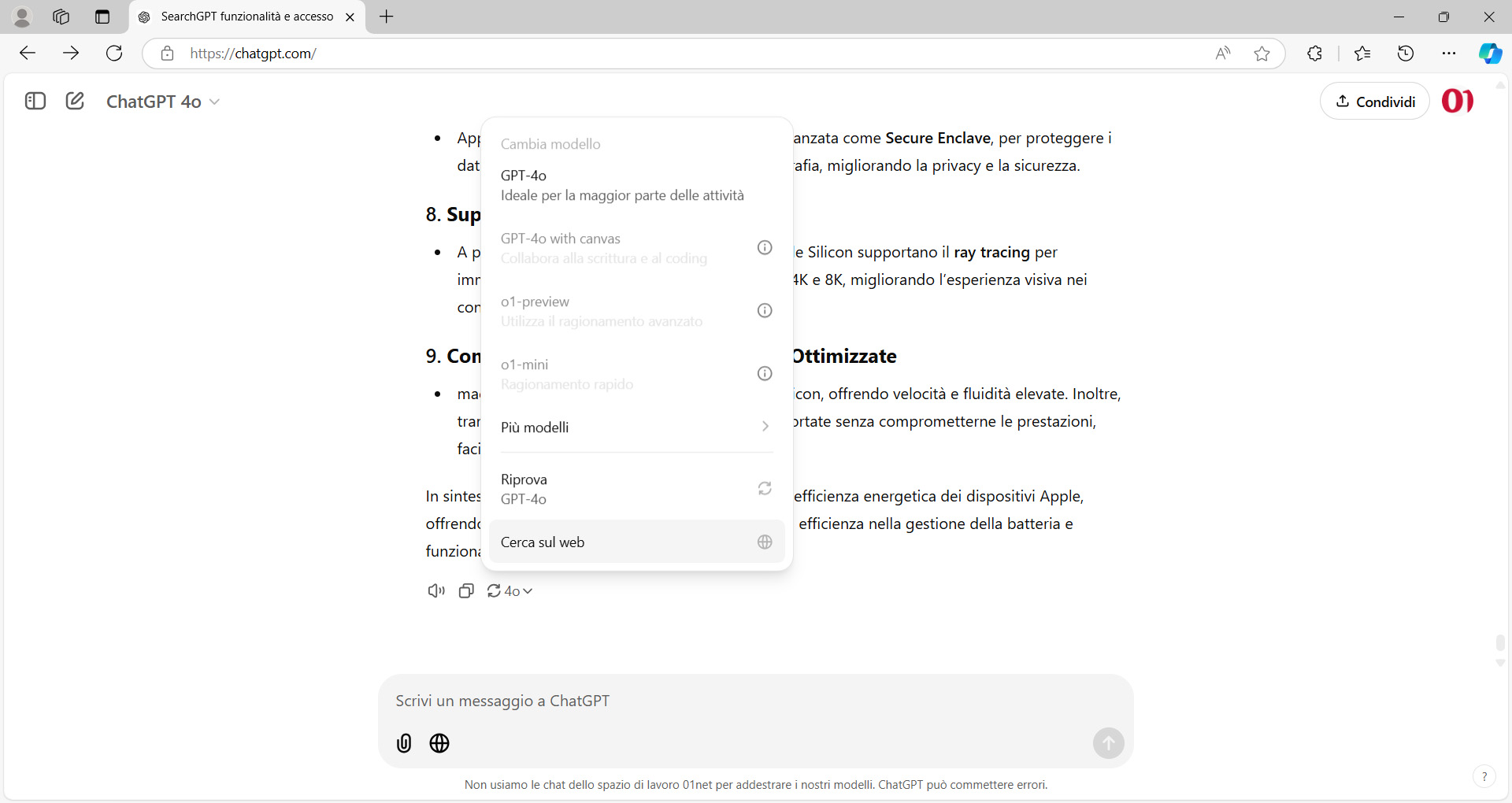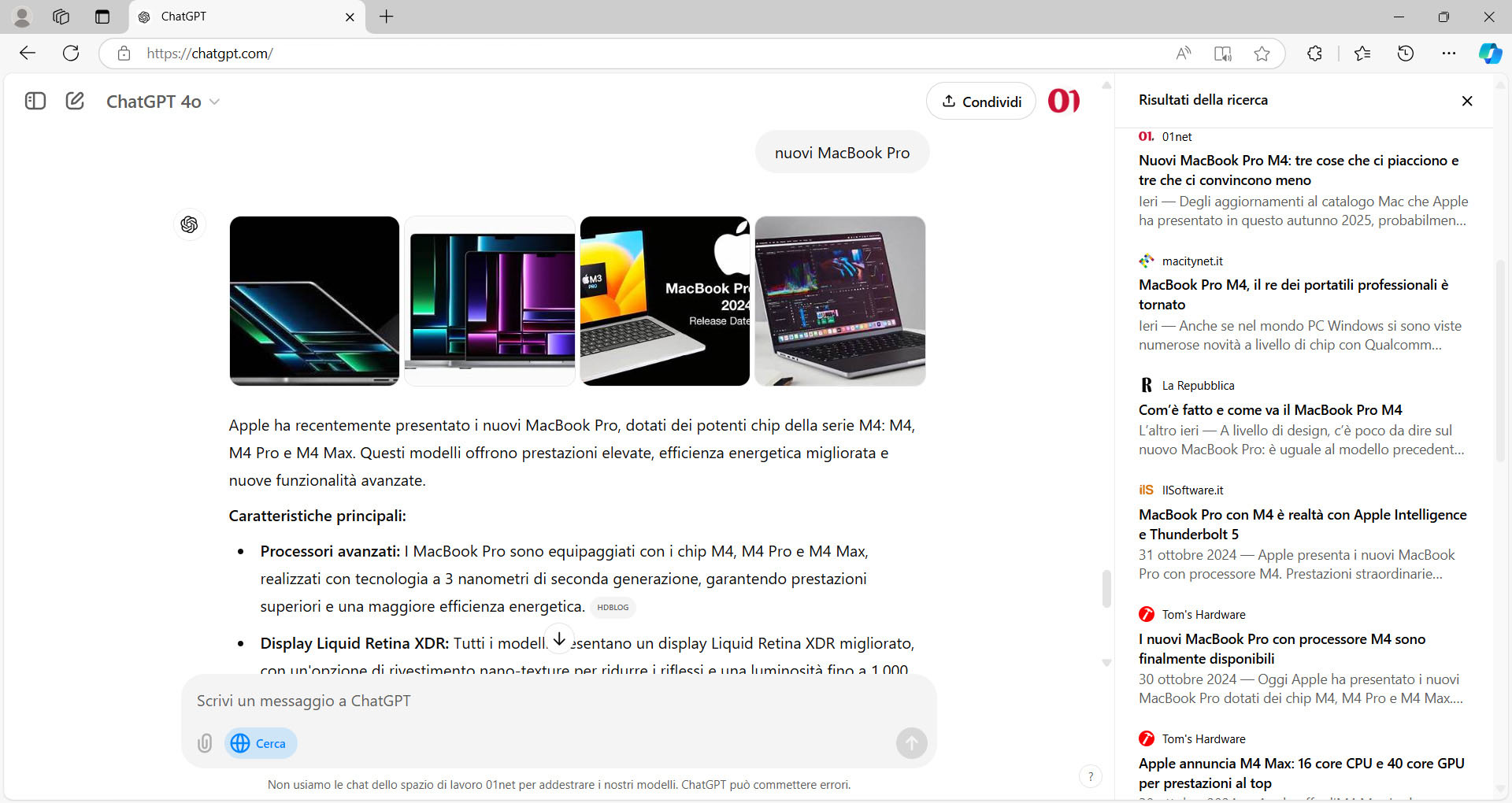 Ad esempio, abbiamo potuto chiedere a ChatGPT search informazioni sui nuovi Mac mini e nuovi MacBook Pro da poco presentati da Apple. In questo, il vantaggio di ChatGPT search è chiaro ed evidente: con la funzione Cerca, infatti, abbiamo ricevuto una risposta con le informazioni principali sull’ultima generazione lanciata di recente.
