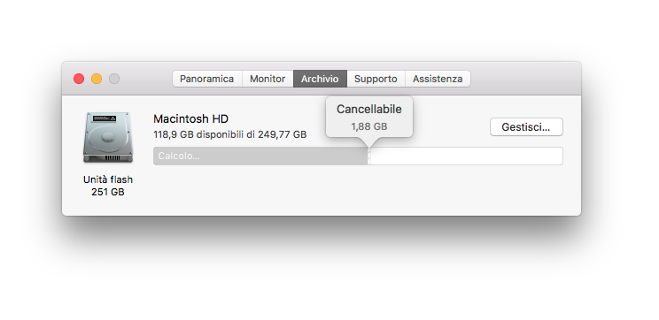 Lo spazio cancellabile è visibile solo per chi sta usando macOS Sierra e ha attivato la funzione di ottimizzazione automatica dello spazio disco. Si tratta della funzione Ottimizza archiviazione che si raggiunge cliccando sul pulsante Gestisci proprio nel pannello di sintesi che abbiamo aperto.