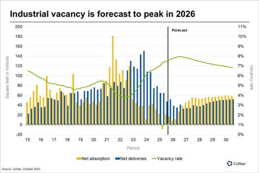 Despite the return of positive net absorption in the third quarter of 2025, the near-term U.S. industrial outlook remains consistent with the previous forecast, which projected a rise in vacancy rates through 2026 and a fourth consecutive year of moderating demand.