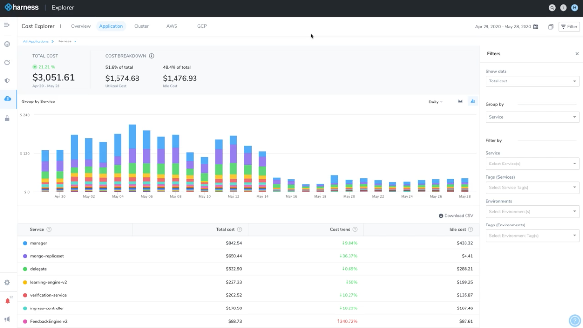 La soluzione di Harness consente agli sviluppatori di visualizzare i costi realmente utilizzati, inattivi e non allocati dei servizi in esecuzione su cluster Kubernetes e Amazon ECS.