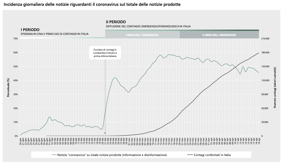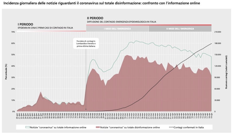 Nel secondo mese dell’emergenza epidemiologica in Italia, l’attenzione attribuita dalle fonti di disinformazione al Covid-19 rimane elevata, evidenzia Agcom, 37% del totale, nella settimana dal 13 al 19 aprile, pur attestandosi su valori inferiori rispetto a quelli registrati tra il 10 e il 20 marzo.