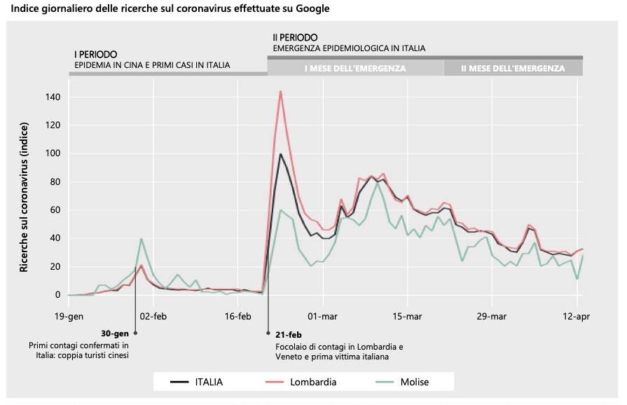 Dal lato degli utenti, dopo aver toccato valori molto elevati nelle settimane più critiche dell’emergenza, si registra una diminuzione delle ricerche effettuate in rete sul coronavirus, così come delle interazioni dei cittadini sui social con i contenuti inerenti all’argomento e del tempo speso nella visione di video online sul tema.