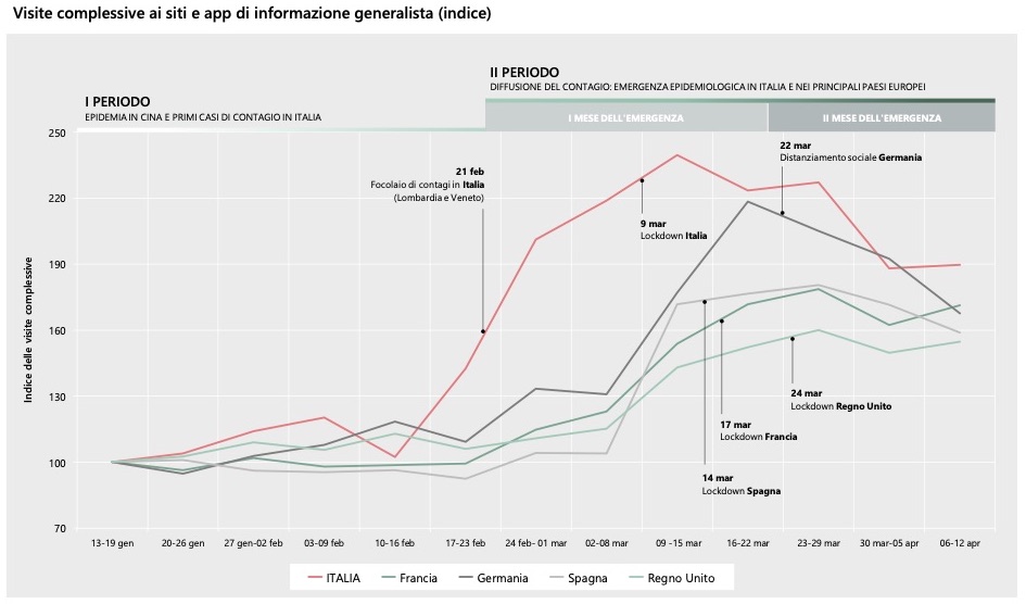 In linea generale, spiega Agcom, durante l’epidemia in Europa si riscontra un’impennata dei consumi dei servizi di comunicazione online. Nelle settimane dell’emergenza, l’Italia è il Paese che mostra i tassi di crescita più elevati sia per la fruizione di informazione online, sia per l’utilizzo di social network e siti e app di messagistica.