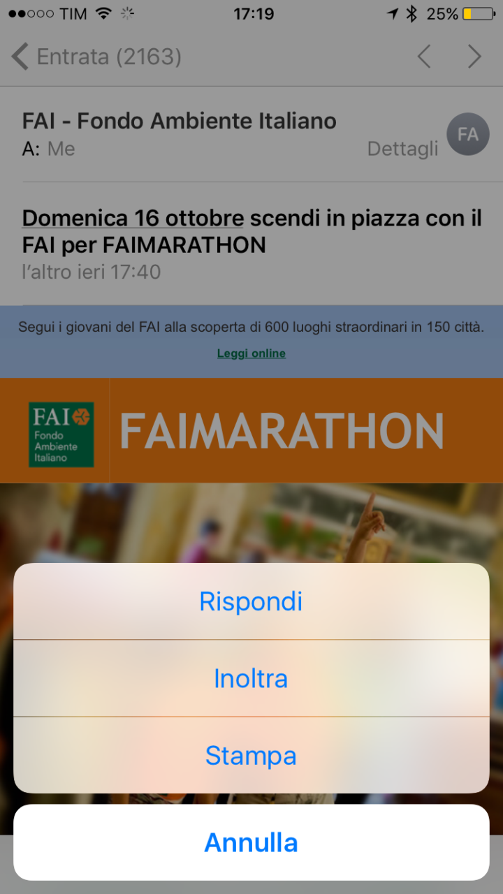 In Mail, apriamo il messaggio che vogliamo convertire in PDF e tocchiamo il pulsante per rispondere, che comprende anche il comando Stampa. Scegliamo quello per portarci nella sezione per definire i parametri della stampa.