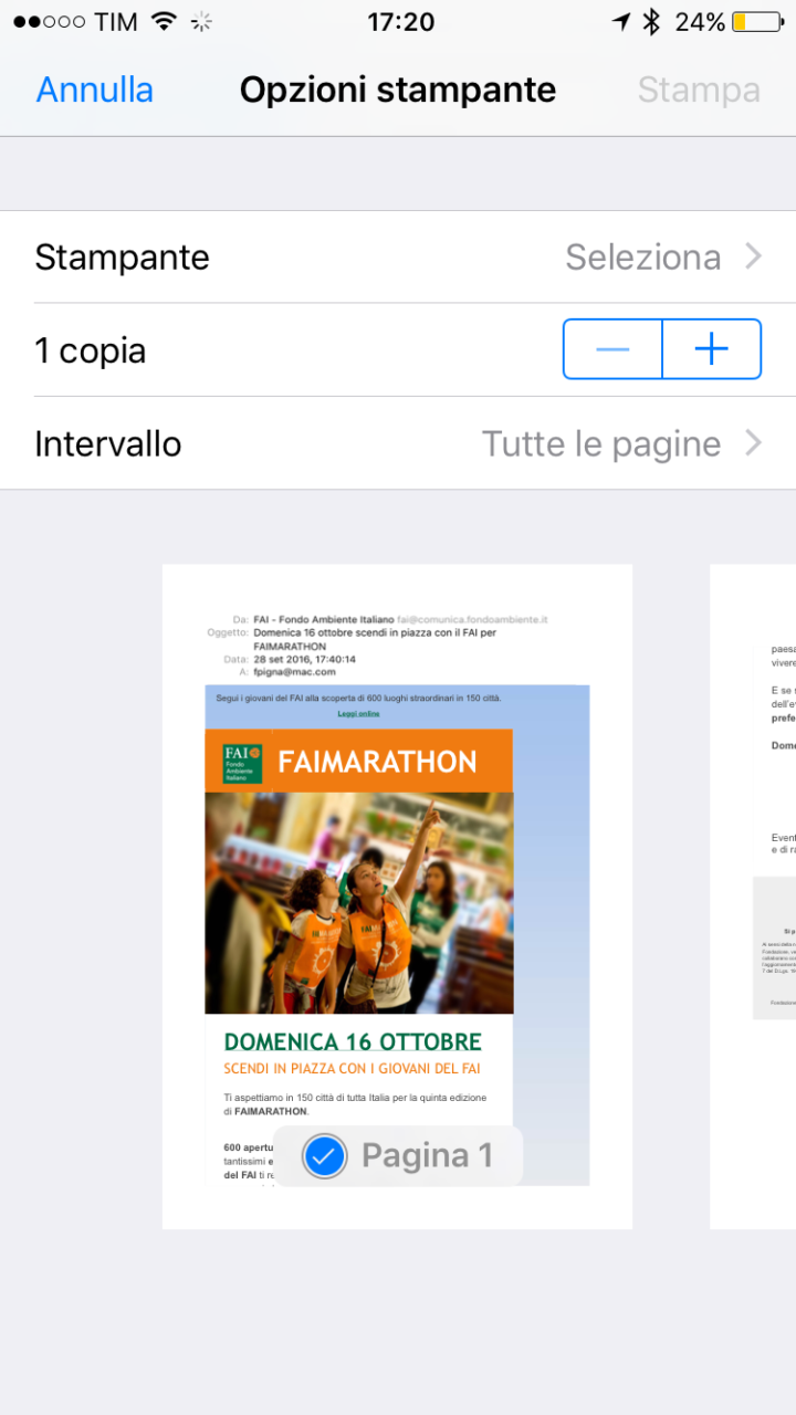 La sezione in cui si indicano i parametri di stampa comprende in basso un’anteprima del documento, in questo caso l’email, per come verrà stampato. Questa è l’anteprima – e qui sta il bello – di un documento PDF. iOS ha già risolto da solo il nostro problema di creare PDF, in sostanza.