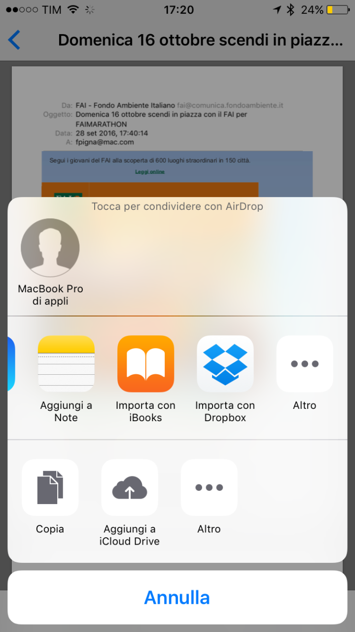 Il formato PDF è uno standard accettato da tutti e a volte conviene creare PDF anche a partire da “documenti” che sarebbero più leggeri e comunque comprensibili in formato nativo. È anche il caso dei messaggi di posta elettronica, ma se su Mac qualsiasi funzione di stampa può generare anche un file PDF, se gestiamo la posta da Mail su iOS questo non è possibile perché le funzioni di stampa di AirPrint hanno una natura diversa.