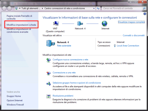 Collegandosi da un sistema Windows 7, si dovrà aprire la finestra Centro connessioni di rete e condivisione digitando semplicemente centro connessioni nella casella Cerca programmi e file del pulsante Start.