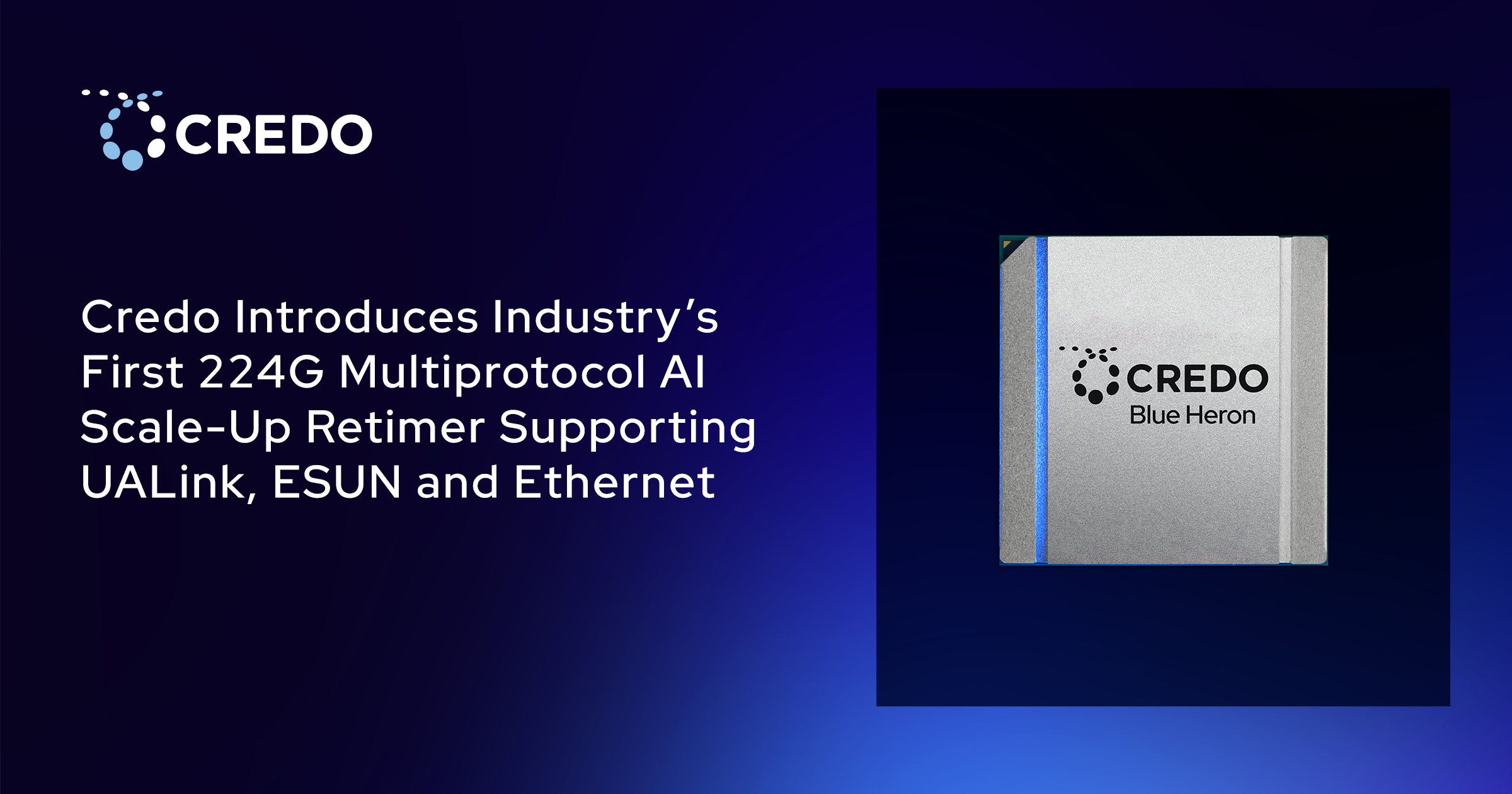 SAN JOSE, Calif.--(BUSINESS WIRE)--#WeConnect--Credo Technology Group Holding Ltd (Credo) (NASDAQ: CRDO), an innovator in providing connectivity at scale through fast, reliable, and energy-efficient system solutions, today announced its Blue Heron 224G AI scale-up retimer, optimized to support the growing need for extended cable and PCB backplane links using UALink, ESUN, and Ethernet protocols.