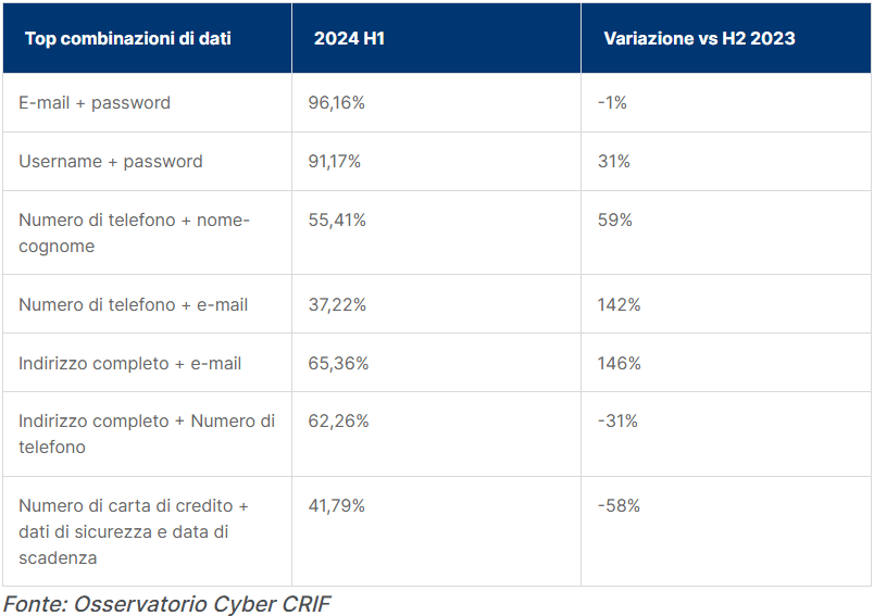 Infine, particolarmente rilevante è la combinazione di numero di carta di credito, rilevata nel 41,79% dei casi, con i dati di sicurezza e la data di scadenza. Sebbene questa risulti in calo nei primi 6 mesi dell’anno, rimane comunque un elemento estremamente preoccupante perché collegata al rischio di frodi finanziarie.
