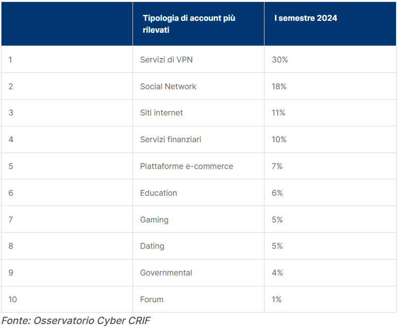 Tra le tipologie di servizi a cui corrispondono gli username ritrovati sul dark web, con l’esclusione dei servizi di posta elettronica, nel I semestre 2024 risultano essere al primo posto (30%), i servizi di VPN (Virtual Private Network), sistemi sempre più utilizzati globalmente anche da account privati che permettono di creare una connessione sicura e privata a Internet, anche quando si naviga su una rete pubblica o poco sicura, come il Wi-Fi di un bar, di un treno o di un aeroporto. Al secondo posto account relativi ai più diffusi social network (18%), mentre al quarto e quinto posto, si sottolinea il furto di account relativi a servizi finanziari (10%), come piattaforme di pagamento, e account di siti di e-commerce (7%).