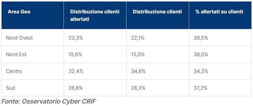 Di conseguenza, le aree geografiche in cui vengono allertate più persone sono il Centro (32,4%) e il Nord (38,9% nel complesso), ma in proporzione sono gli abitanti del Nord Ovest e del Nord Est che hanno ricevuto più alert per il furto dei dati.