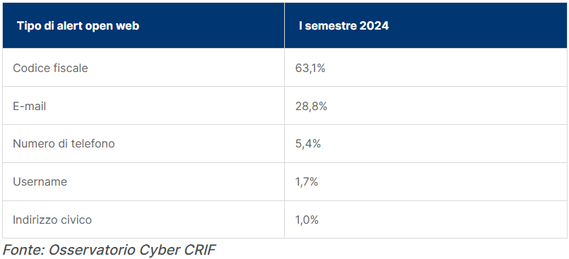 Sempre per quanto riguarda il nostro Paese, nel primo semestre 2024 i dati più frequentemente rilevati sull’open web – quindi pubblicamente accessibili da chiunque sul web – sono stati il codice fiscale (63,1% dei dati rilevati) e l’e-mail (28,8%), seguiti a distanza da numero di telefono (5,4%), username (1,7%) e indirizzo civico (1%).