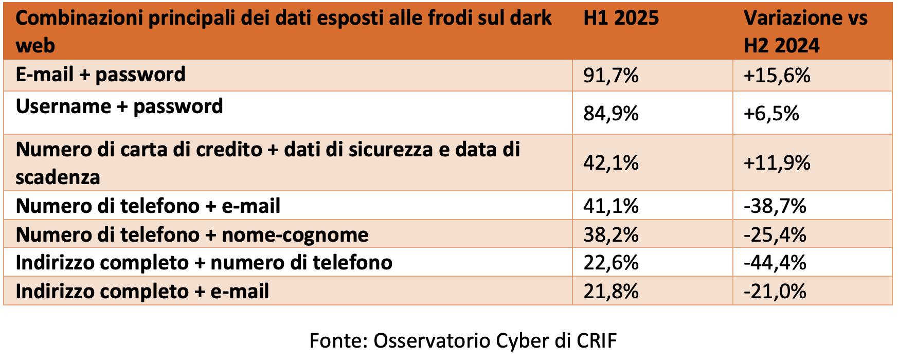 CRIFAnalizzando le principali combinazioni di dati esposti CRIF osserva che, nel primo semestre 2025, la combinazione di e-mail e password risulta la più frequente, presente nel 91,7% dei casi, mentre nel 84,9% dei casi la password è associata allo username. Un altro dato appetibile per i cyber criminali risulta essere il numero di telefono, associato alla e-mail nel 41,1% dei casi, e al nome e cognome nel 38,2% dei casi. Infine, particolarmente rilevante è la combinazione di numero di carta di credito, rilevata nel 42,1% dei casi con i dati di sicurezza e la data di scadenza, in crescita del +11,9%, dato estremamente preoccupante per il rischio di frodi finanziarie, che evidenzia la necessità di utilizzare protezioni come l’autenticazione a due fattori (2FA) per proteggersi.