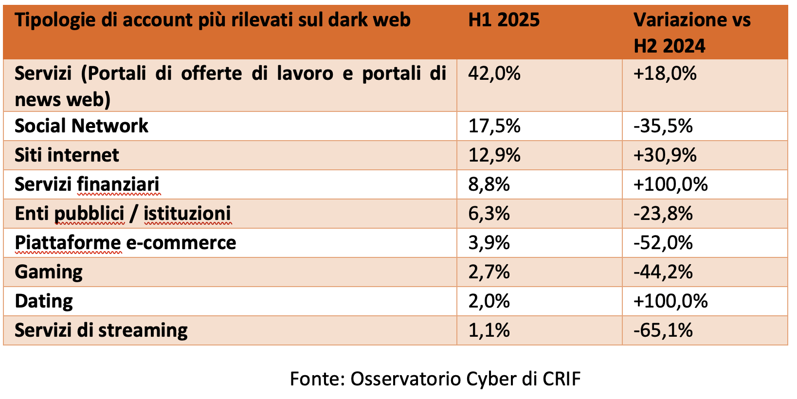 Da un’analisi qualitativa dei contesti in cui i dati circolano è emerso che, escludendo i servizi di posta elettronica, le username trovate sul dark web sono maggiormente associate agli account di servizi (portali di offerte di lavoro e portali di news web) che occupano il primo posto (42,0%), seguiti dagli account relativi ai social network più diffusi (17,5%) e a siti Internet (12,9%). Al quarto e quinto posto si evidenziano invece i furti di account legati a servizi finanziari (8,8%) e a enti pubblici o istituzioni (6,3%), mentre i siti di e-commerce scendono al sesto posto (3,9%).