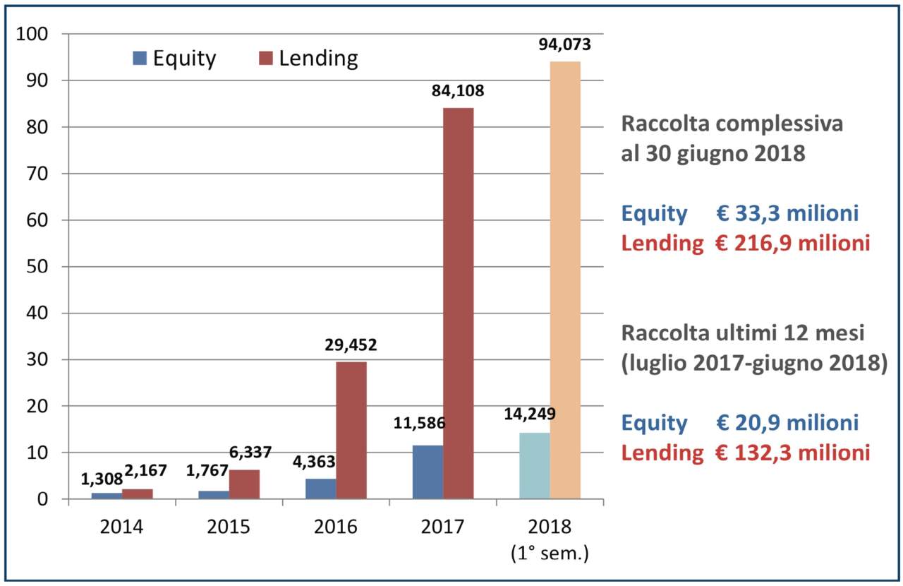 Al 30 giugno 2018, l’equity crowdfunding, tipologia che prevede la sottoscrizione di capitale di rischio, per cui l’investitore diventa a tutti gli effetti socio dell’impresa, ha raggiunto complessivamente un valore di 33,3 milioni di euro, con una raccolta di 20,9 milioni di euro solo nell’ultimo anno, oltre il triplo rispetto a quello scorso.
