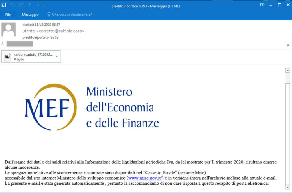 La campagna impatta utenti italiani, tra cui destinatari del dominio tesoro.it, veicolando il contenuto malevolo attraverso diverse varianti di email di phishing contenenti riferimenti al Ministero dell’Economia e delle Finanze (MEF).